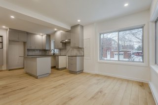 (Possibility to include appliances)Superb fully renovated main unit offering 4 bedrooms, 1 full bathroom, and 1 powder room. Modern kitchen with quartz countertops, new flooring, private entrance, laundry room, and 1 outdoor parking space (driveway). Prime location with easy access to all services. Spacious, bright, and move-in ready!